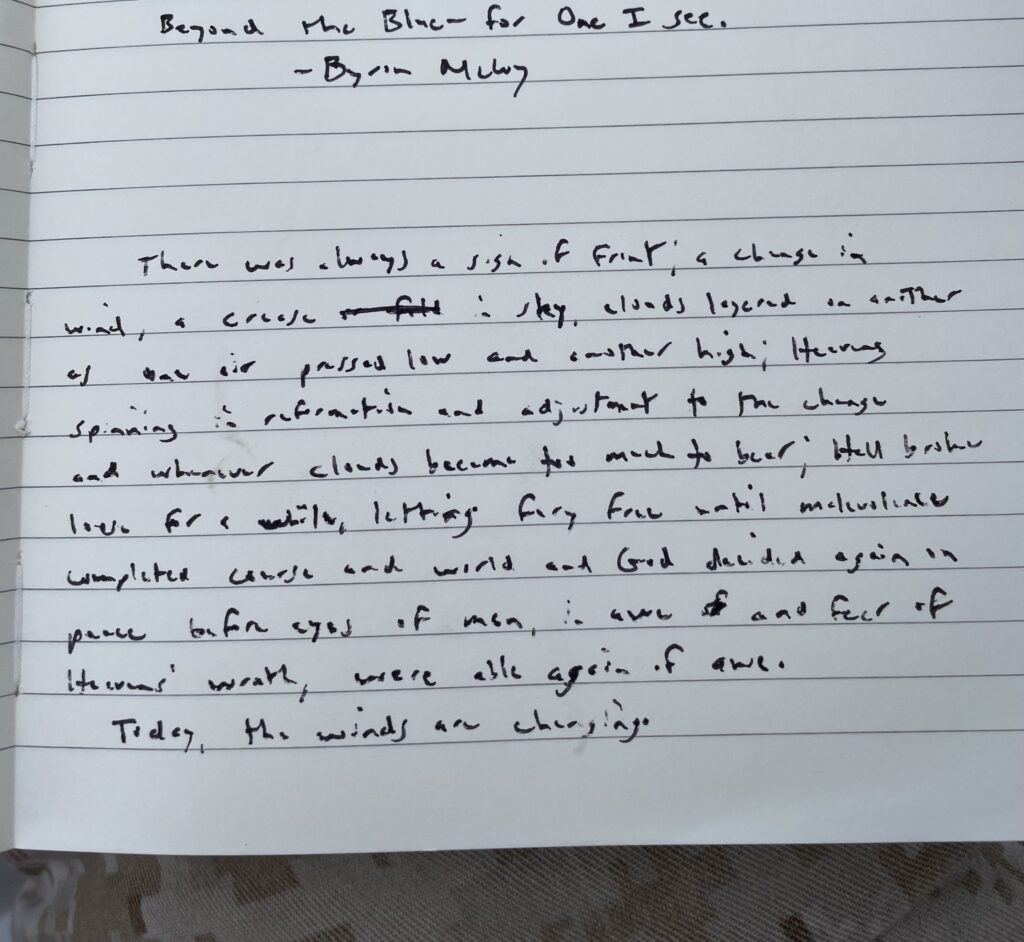 There are always signs of fronts, competition for skies and dominion of all beneath: a change in wind, a crease in sky, clouds layered on anther as one ascends and another is made low. Reacting, heavens circle in spin and reformation, adjustment, the shift. Then, when conflict in clouds become beyond heavens’ bearing, Hell lets loose for a time. Fury and violence are freed until malevolence runs its course and in after broken wake, God grants an interim of peace—the chance to choose again—when in fear and trembling of Heaven’s allowed wrath, men’s souls restore again to an ability for awe.