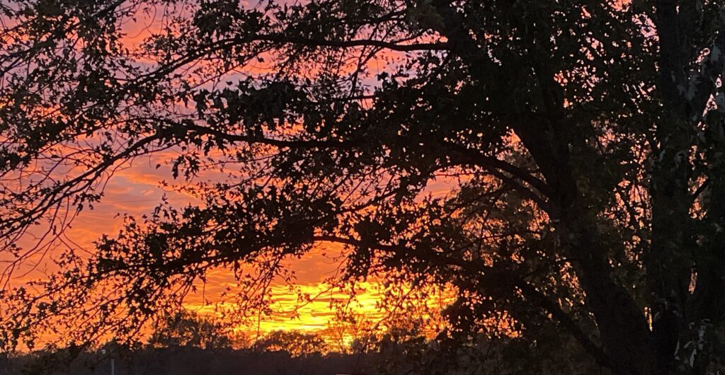 Picture couldn’t capture all—details of the sky: amber underbellies of undulant clouds, violet in their folds and space between, slow shift and rearranging, living canvas that was God’s; one which from beginning man has always witnessed but failed to notice now as often as before. The beauty was always there, on days and eves such as this; thinning of the autumn leaves, limb shadows in the foreground, horizon silhouette in far. A picture is worth a thousand words—sometimes. And sometimes, words paint more true: spirit filling in what lens cannot.