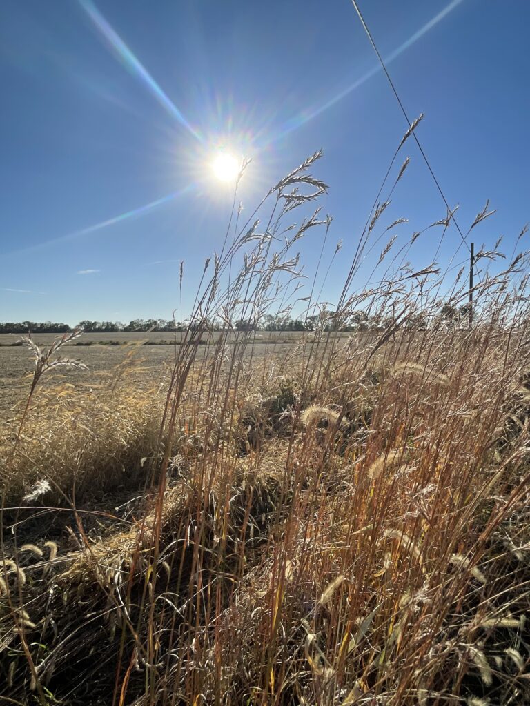 She fixed to the sun beyond wind dance of the paled bluestem waving in near’s view.