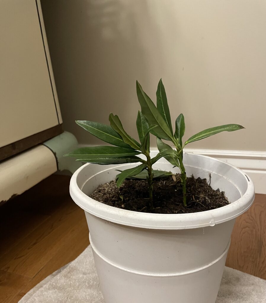 I water it each day, enough to keep the soil damp knowing the biggest thing that I can do for it to live and thrive is to help it set and put down roots; rots grown from a cutting in winter-time, that shouldn’t work—but might.